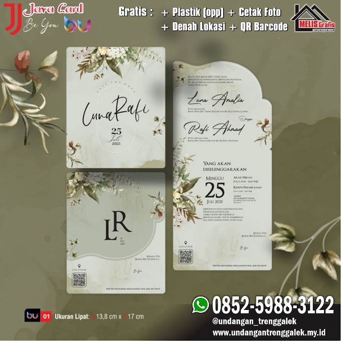 Kartu Ucapan Terima Kasih, Tambah Denah Lokasi, Tambah Scan Barcode Lokasi (QR Code), Cetak Foto di Undangan, Soft Copy File (Preview untuk Proses Revisi), dan Packing Kardus.